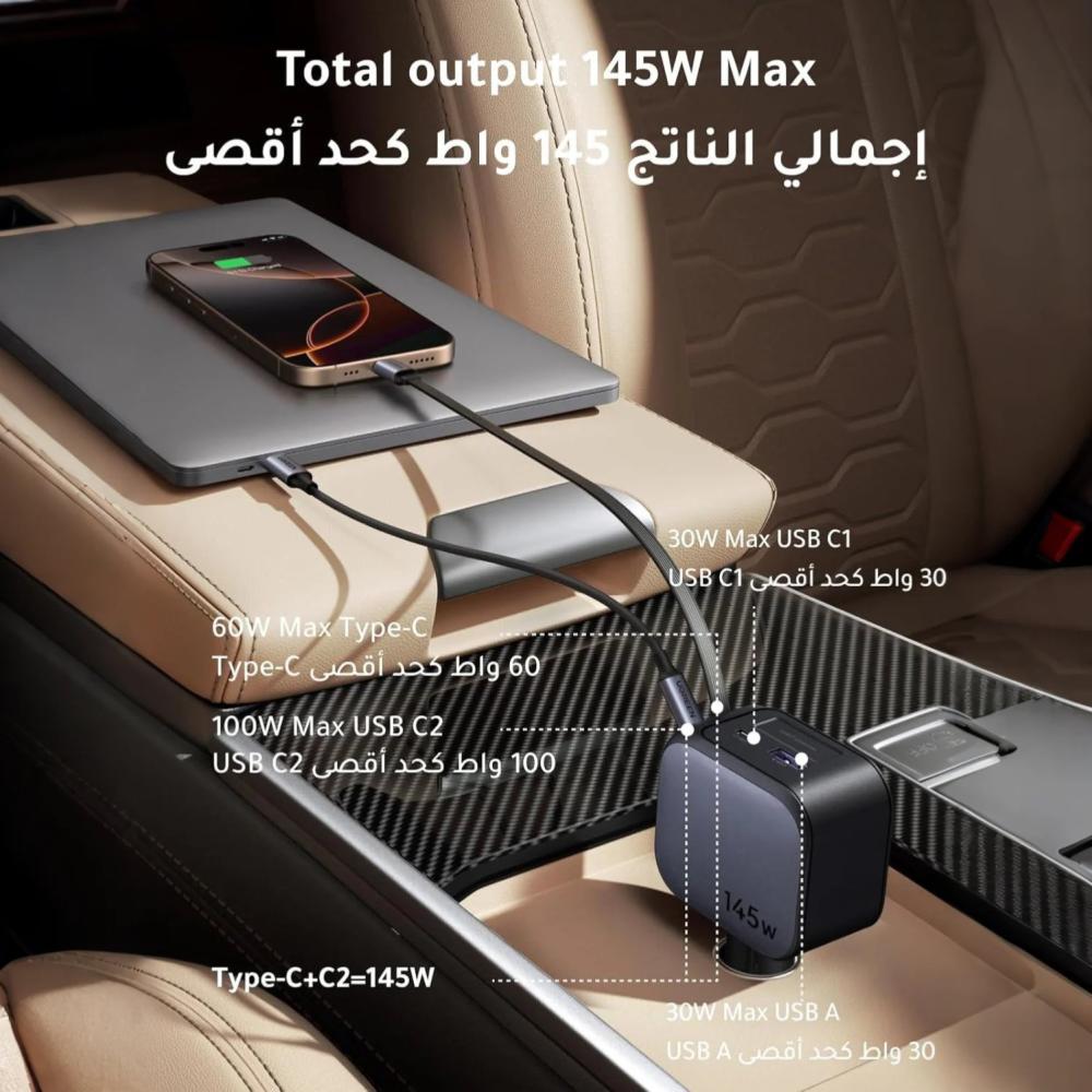 شاحن سيارة عالي الأداء يمنحك تجربة شحن سريعة وموثوقة أثناء القيادة. يتميز بتصميم أنيق ومتين مع كابل USB-C مدمج لراحة أكبر وحماية من تلف الكابل، إضافة إلى منفذ USB-C إضافي ومنفذ USB-A لشحن أكثر من جهاز في وقت واحد.